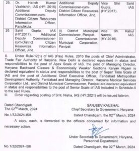 पंजाब दस्तक, सुरेंद्र राणा: हरियाणा सरकार ने ब्यूरोक्रेसी में बड़ा बदलाव किया है। सरकार की ओर से 26 आईएएस अफसरों की ट्रांसफर लिस्ट जारी की गई है। इस लिस्ट में आईएएस ऑफिसर जी अनुपमा से हेल्थ डिपार्टमेंट लेकर एजुकेशन की जिम्मेदारी दी गई है। साथ ही आईएएस उत्तम सिंह को सीएम सिटी करनाल का डीसी बनाया गया है।