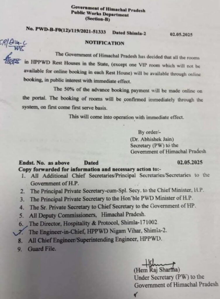 शिमला, सुरेन्द्र राणा; हिमाचल प्रदेश में लोक निर्माण विभाग के विश्राम गृहों में कमरा लेना अब…