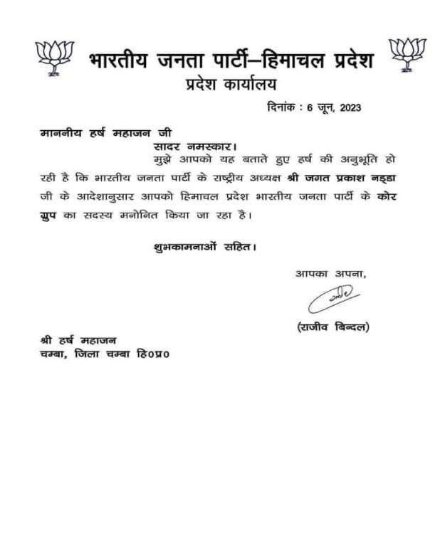 • भाजपा नेता हर्ष महाजन बीजेपी कोर ग्रुप के सदस्य बने