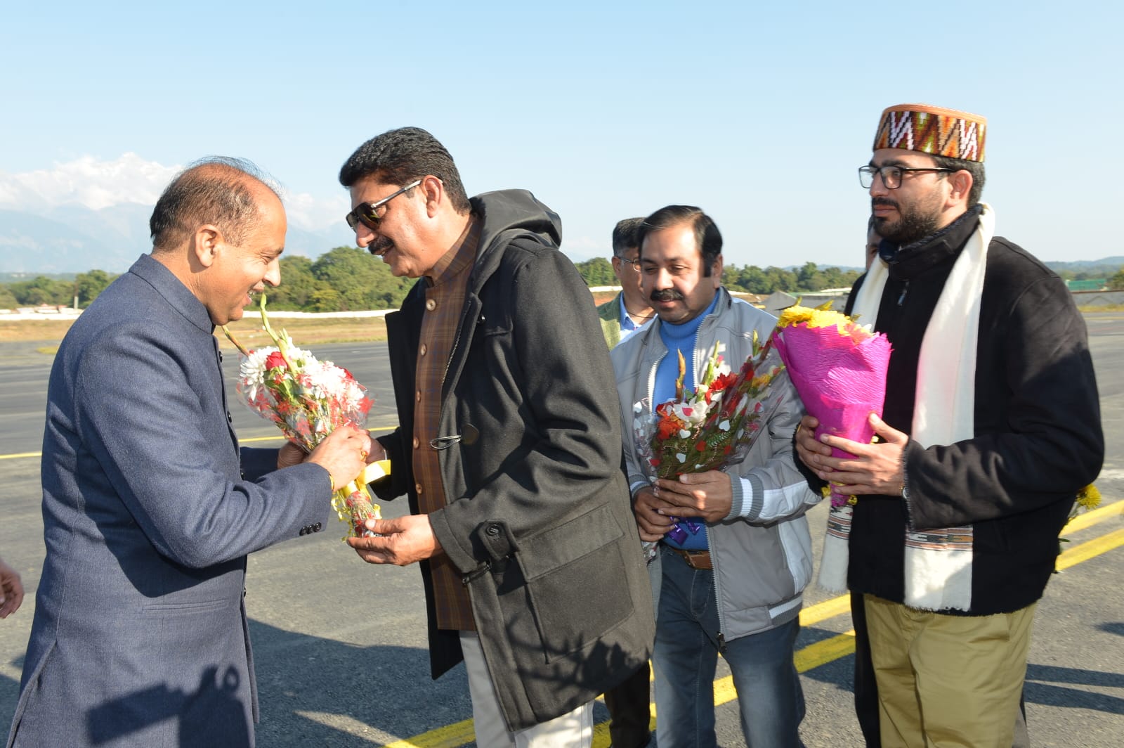 वन व युवा सेवाएं एवं खेल मंत्री राकेश पठानिया, धर्मशाला के विधायक विशाल नेहरिया, वूल फेडरेशन के अध्यक्ष त्रिलोक कपूर और अन्य स्थानीय नेताओं ने गग्गल हवाई अड्डे पर मुख्यमंत्री का स्वागत किया।