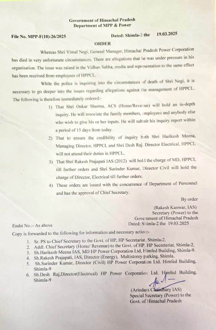 एचपीपीसीएल के जीएम विमल नेगी की मौत के मामले में सरकार का बड़ा एक्शन।