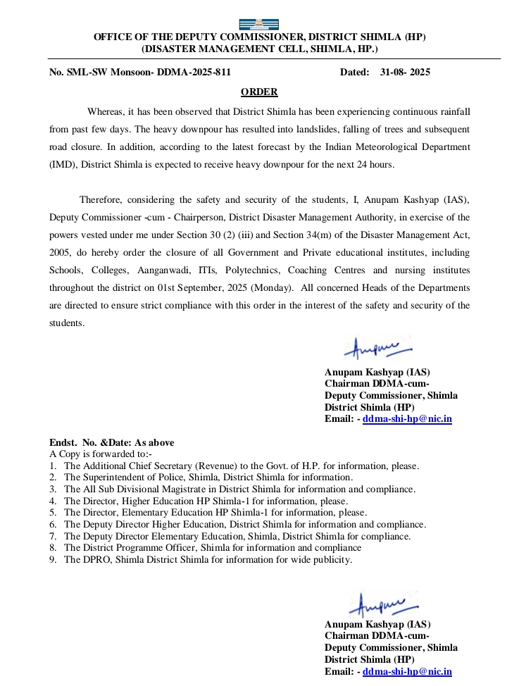 बारिश का अलर्ट, कल शिमला जिला के शिक्षण संस्थान बंद रखने के आदेश
