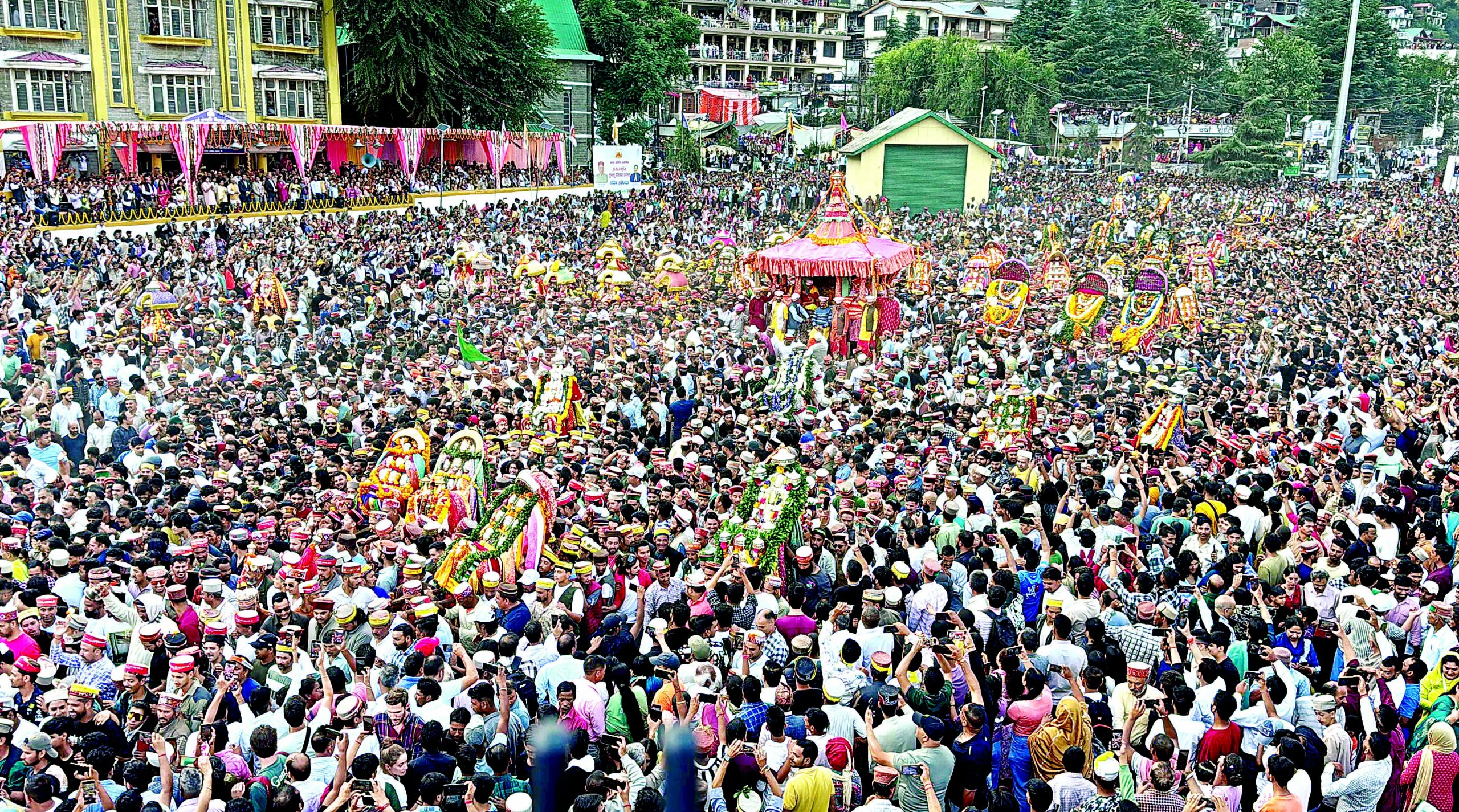 कुल्लू, काजल; भगवान रघुनाथ जी की अलौकिक रथयात्रा और अनूठे देव-मानस मिलन के साथ गुरुवार को देश-दुनिया के सबसे बड़े देव समागम ‘अंतरराष्ट्रीय कुल्लू दशहरा’ उत्सव का भव्य आगाज हुआ। भगवान राघव की विस्मृत कर देने वाली इस भव्य रथयात्रा में देवी हिडिंबा, बिजली महादेव, ज्वाणी महादेव, देवता नाग धूमल समेत ठारा करड़ू देवताओं ने भाग लेते हुए धरा पर हुए इस सबसे बड़े देव समागम में चार चांद लगा दिए। ठीक साढ़े चार बजे शुरू हुई भगवान रघुनाथ की इस अद्भुत, अलौकिक, अद्वितीय रथयात्रा में घाटी के काफी संख्या में देवी-देवताओं ने हिस्सा लेकर रथयात्रा की शोभा को बढ़ा दिया। हिमाचल प्रदेश के हजारों श्रद्धालु इस पल के साक्षी बने। हजारों की संख्या में लोगों ने अधिष्ठाता देव भगवान रघुनाथ के रथ को खींचकर पुण्य भी कमाया। इतना ही नहीं, विदेशी सैलानी भी इस अद्भुत व अलौकिक नजारे को अपने कैमरे में कैद करने के लिए उत्साहित नजर आए। ढोल-नगाड़ों की थाप के साथ ढालपुर गूंज उठा। भगवान रघुनाथ के साथ देवी-देवताओं की शक्तियां वाद्य यंत्रों की धुनों के साथ चारों तरफ फैलीं, तो हजारों की संख्या में आए श्रद्धालुओं ने अपने आप में यह महसूस किया कि सचमुच उन्हें प्रगट रूप में आशीर्वाद प्राप्त हुआ है।