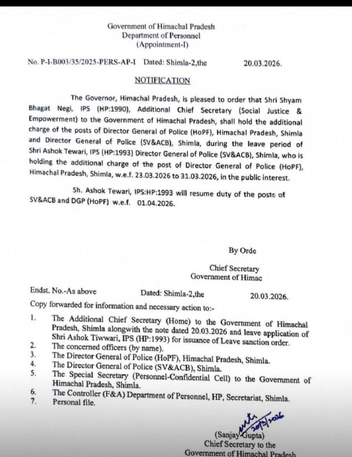 शिमला, सुरेंद्र राणा: हिमाचल प्रदेश सरकार ने 1990 बैच के IPS अधिकारी श्याम भगत नेगी को अस्थायी रूप से पुलिस महानिदेशक का अतिरिक्त कार्यभार सौंपा है। जारी आदेशों के अनुसार, IPS श्याम भगत नेगी को अशोक तिवारी के अवकाश अवधि के दौरान पुलिस महानिदेशक और SV&ACB में DGP का अतिरिक्त प्रभार दिया गया है।अधिसूचना के मुताबिक, यह व्यवस्था 23 मार्च से 31 मार्च तक प्रभावी रहेगी। सरकार ने यह भी स्पष्ट किया है कि अशोक तिवारी 1 अप्रैल 2026 से दोबारा अपने पदों का कार्यभार संभालेंगे।
