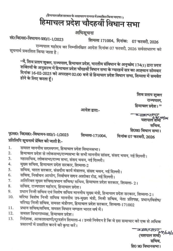 हिमाचल विधानसभा का 16 फरवरी से बजट सत्र:राज्यपाल की मंजूरी के बाद अधिसूचना जारी